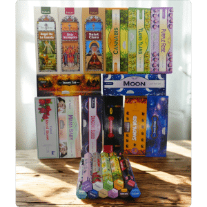 - Tulasi Masala stokjes – handgerolde 15 g-stokjes in bestsellers als Nag Champa Jasmijn, lavendel en sandelhout.