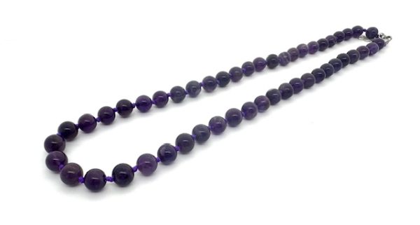 Ontdek de schoonheid en elegantie van onze amethyst kralenketting, verkrijgbaar tegen scherpe groothandelsprijzen. Elke ketting is gemaakt van synthetisch amethyst – bekend om zijn kenmerkende aderstructuur en stijlvolle uitstraling. De gladde, ronde kralen zijn zorgvuldig geregen tot een tijdloos en veelzijdig sieraad, geschikt voor zowel mannen als vrouwen.