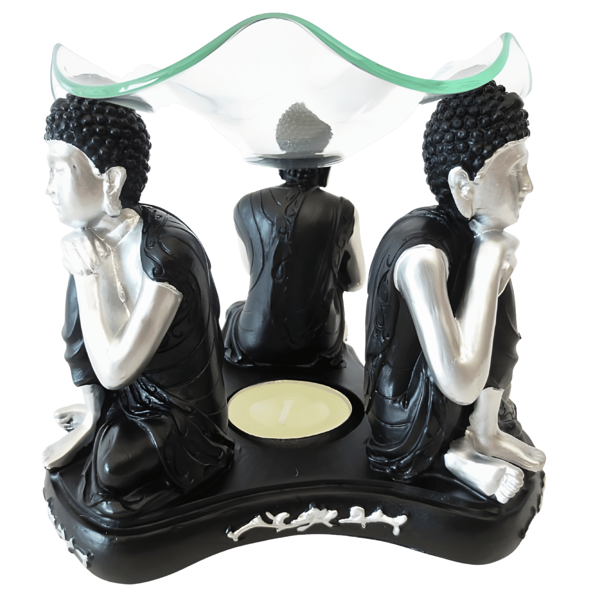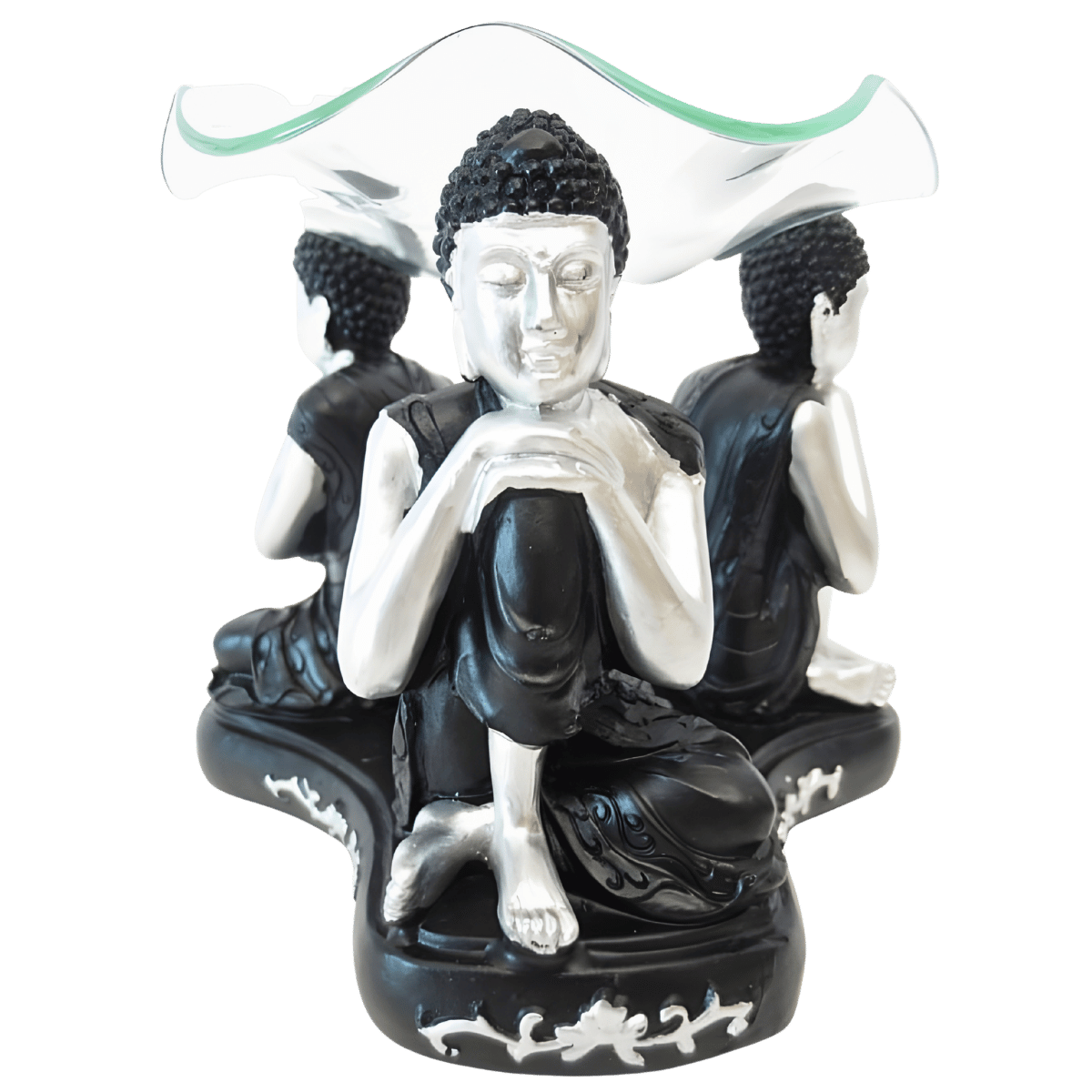 Er zijn verschillende boeddha oliebrander modellen in onze showroom en webshop. Deze drie rustige Boeddha’s zijn zilver/zwart gekleurd.
