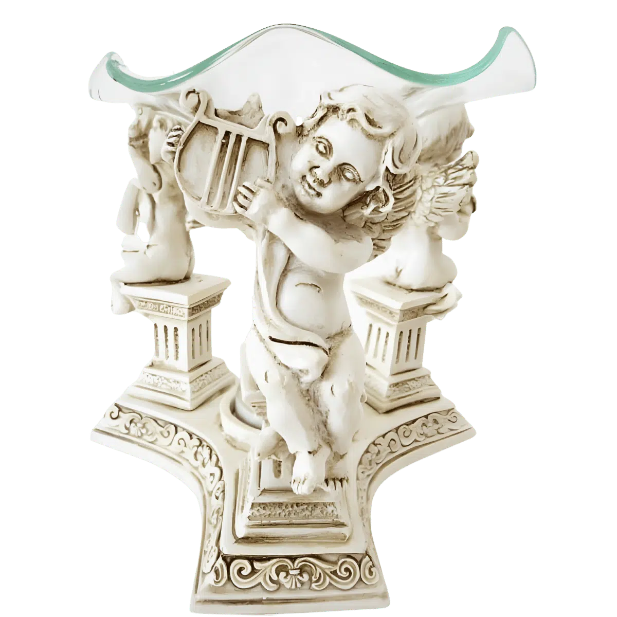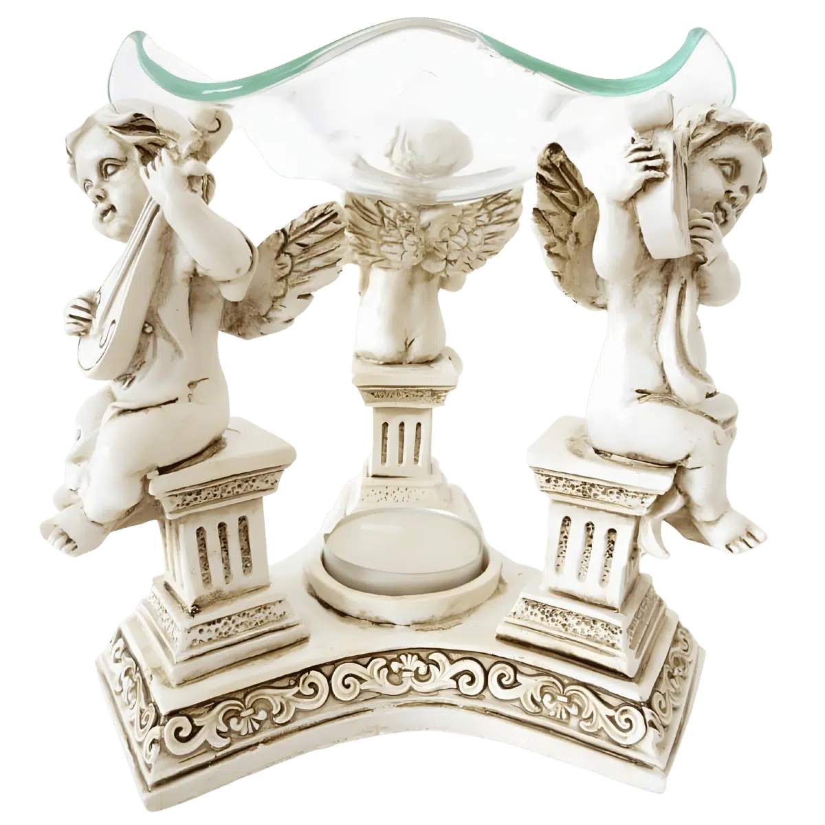 Inbegrepen: Hars oliebrander met drie engelen, afneembare glazen schaal