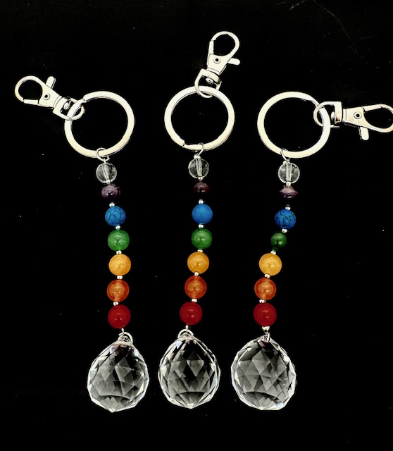 Deze sleutelhanger is voorzien van 7 chakrakralen met een kristallen bol aan het uiteinde. Zodra de kristallen bol in contact komt met licht of zonlicht, zal deze prachtige regenboogkleuren uitstralen.