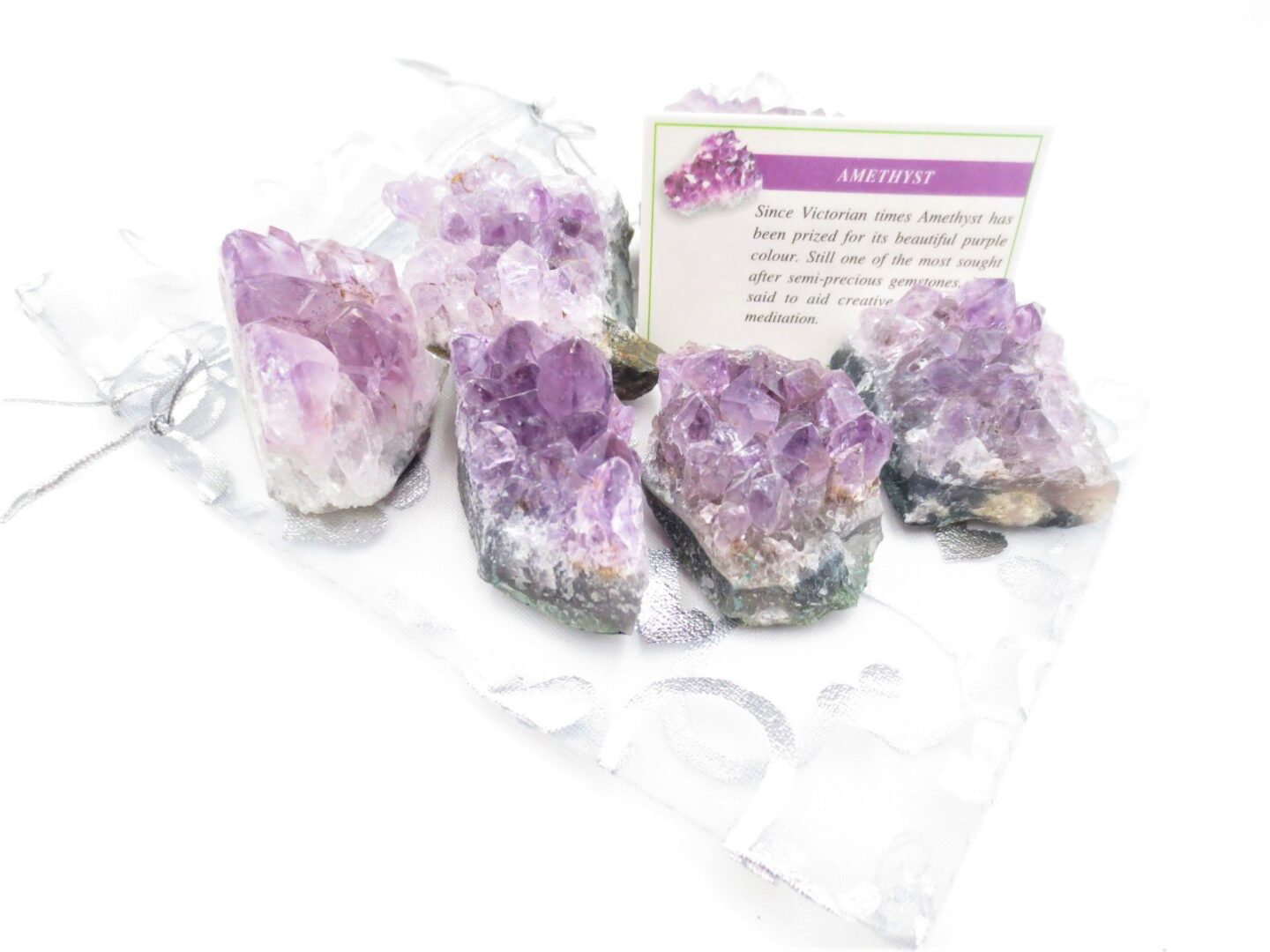 6 Amethyst Cluster stenen verpakt in een organza zakje. Wordt samen geleverd met een kaartje met informatie en werking van de edelsteen