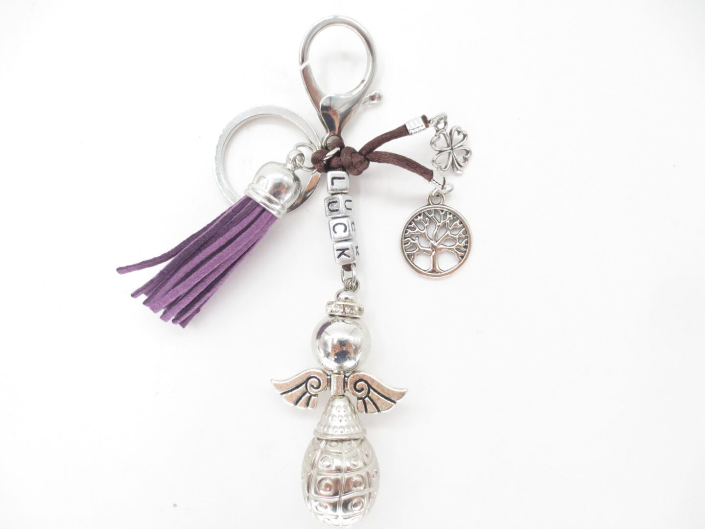 Groothandel – Paarse “LUCK” Angel Sleutelhanger met Tassel, Klaver en Levensboom Hanger