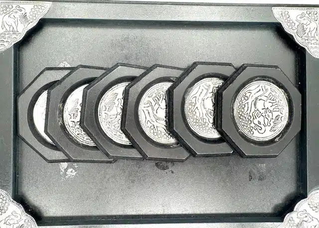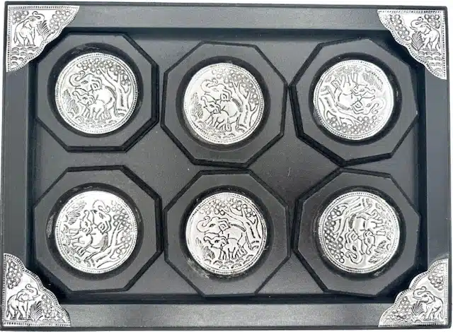 Groothandel – Set metalen onderzetters met olifantenreliëf in Thaise stijl en houten dienblad