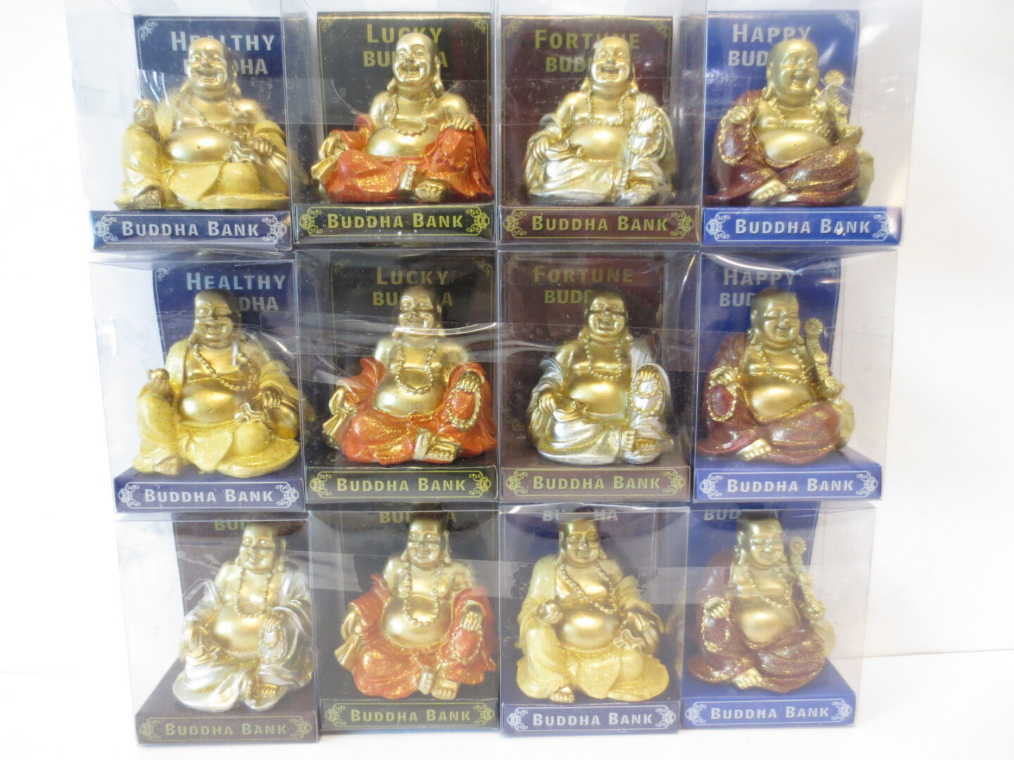 De gift set bestaat uit een mooie display met 12 grote happy Boeddha’s in 4 verschillende kleuren en houdingen. Elk verpakt in aparte doosje.