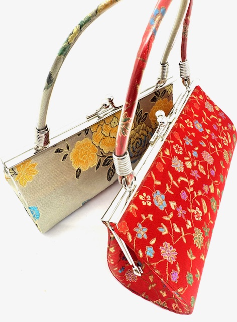 Deze elegante clutch handtas is gemaakt van rijk gedecoreerde brocadestof en afgewerkt met een stevig metalen frame en een klassieke knipsluiting (kiss-lock). Geïnspireerd door traditioneel Aziatisch textielontwerp biedt deze tas een verfijnde combinatie van decoratieve uitstraling en praktisch gebruik.