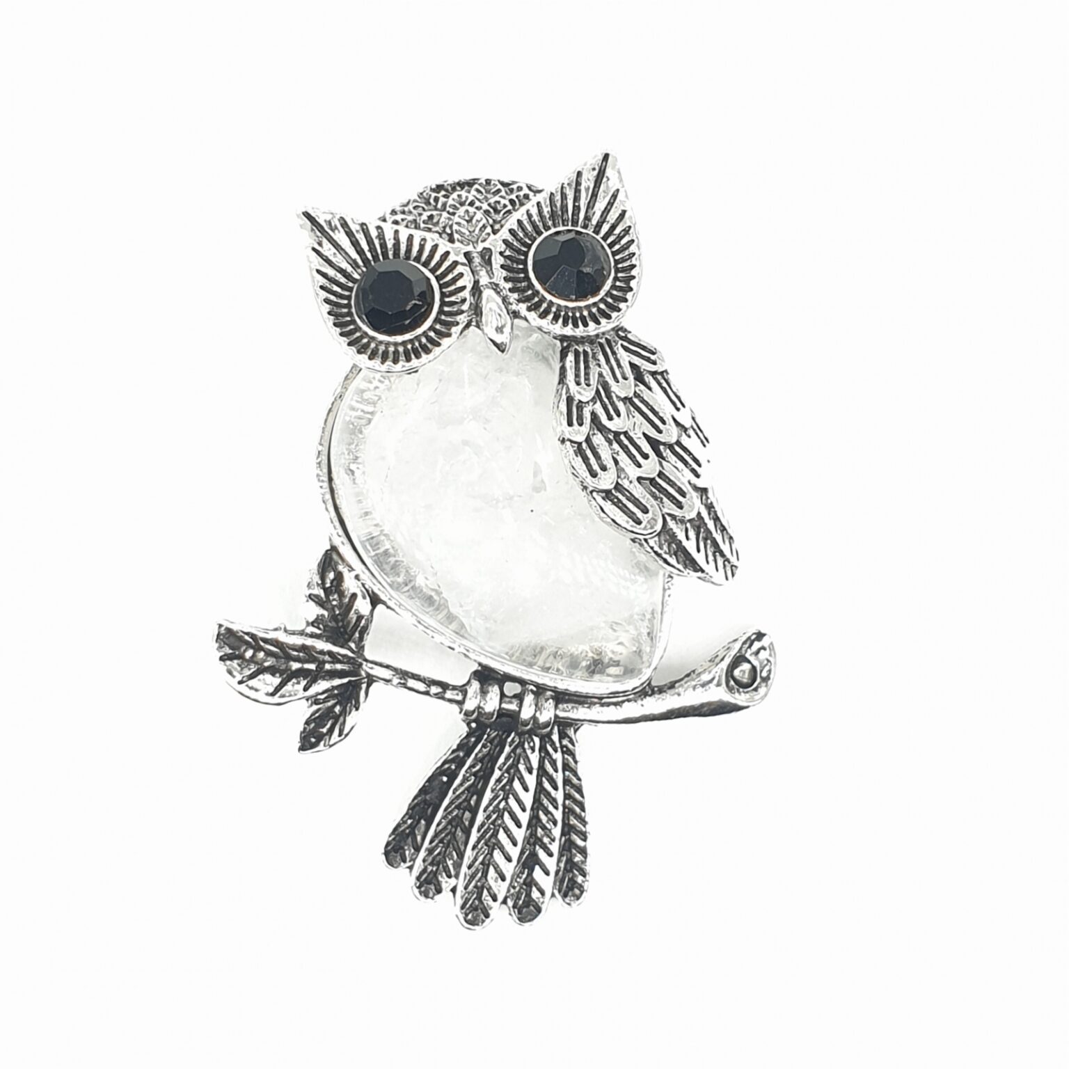 Het gedetailleerde uilontwerp bevat prachtig vormgegeven veren en een gladde bergkristalsteen als lichaam, die het licht vangt met een betoverende, iriserende gloed. De grote ogen van de uil zijn bezet met opvallende zwarte edelstenen, wat een sterk contrast vormt met de zachte, etherische kleur van de bergkristal.