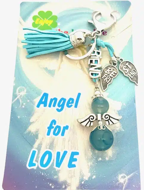 Groothandel – Turkoois “FRIEND” Angel Edelsteen Sleutelhanger met Tassel, Klaver en Levensboom Hanger