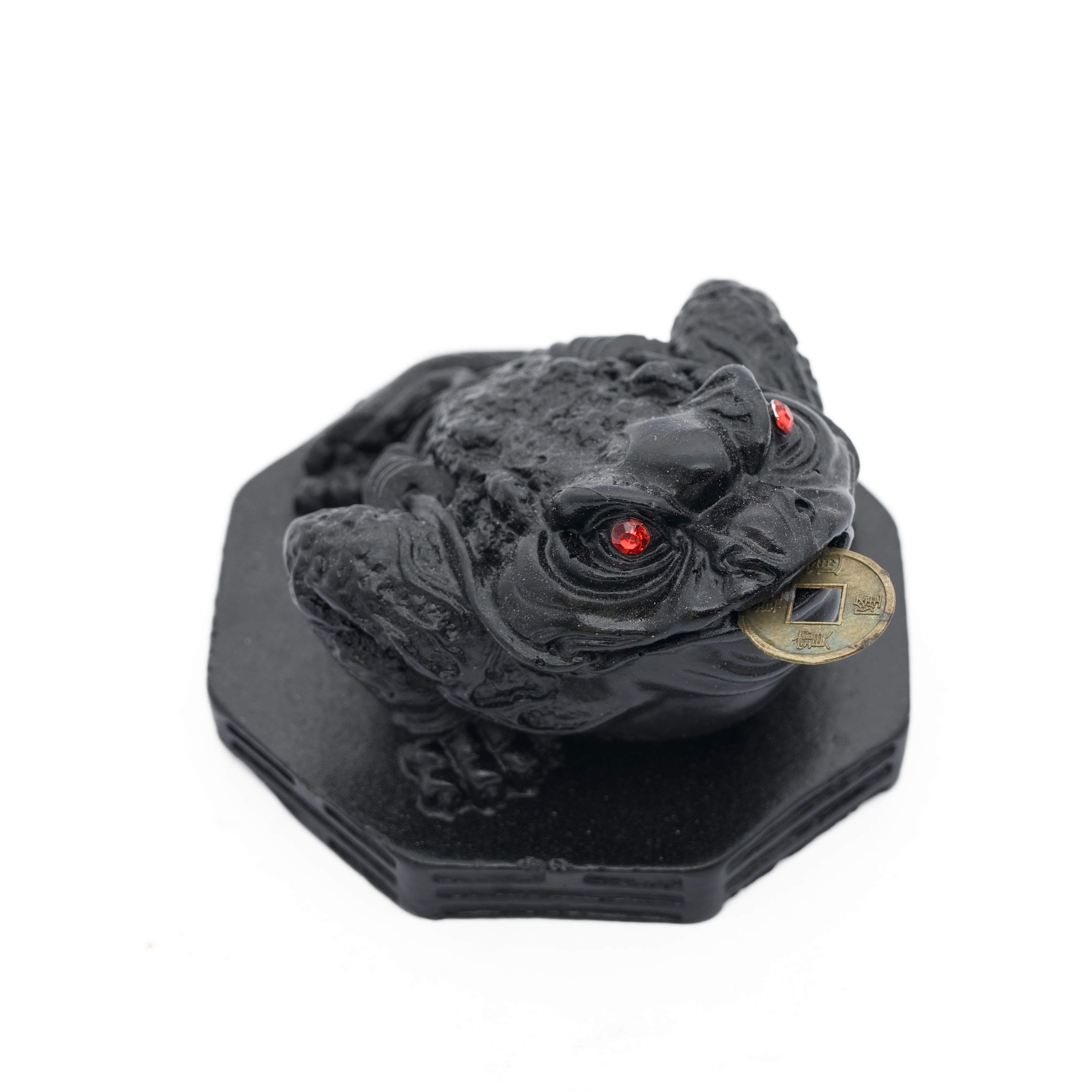 Het gedetailleerde kikkerontwerp toont een munt in de bek, wat staat voor geld dat het huis of de werkplek binnenkomt. De opvallende rode ogen versterken de krachtige uitstraling, terwijl de donkere, gestructureerde afwerking het beeld een mystiek karakter geeft. Geplaatst op een stevige basis is het ideaal voor bureaus, planken, toonbanken of bij de entree.
