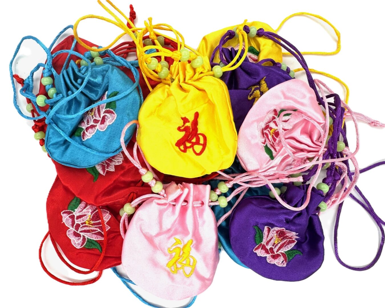 Deze traditionele Chinese cadeauzakjes met trekkoord zijn gemaakt van zachte, zijde-achtige stof en rijk versierd met geborduurde bloemmotieven en gelukbrengende Chinese symbolen. De levendige kleuren en verfijnde borduursels geven elk zakje een luxe en decoratieve uitstraling met culturele betekenis.