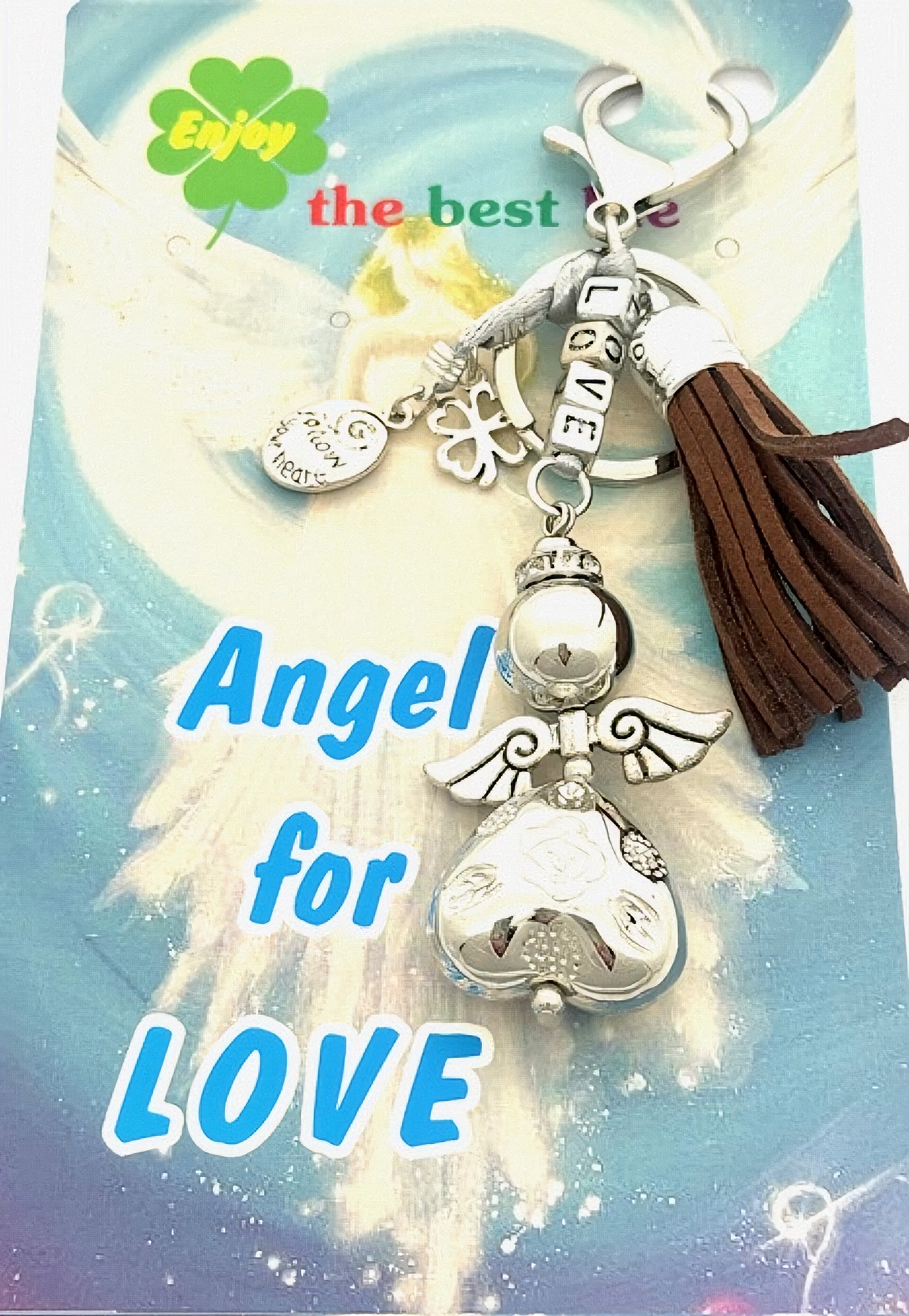 Groothandel – Donkerbruine “LOVE” Angel Sleutelhanger met Tassel, Klaver en Levensboom Hanger