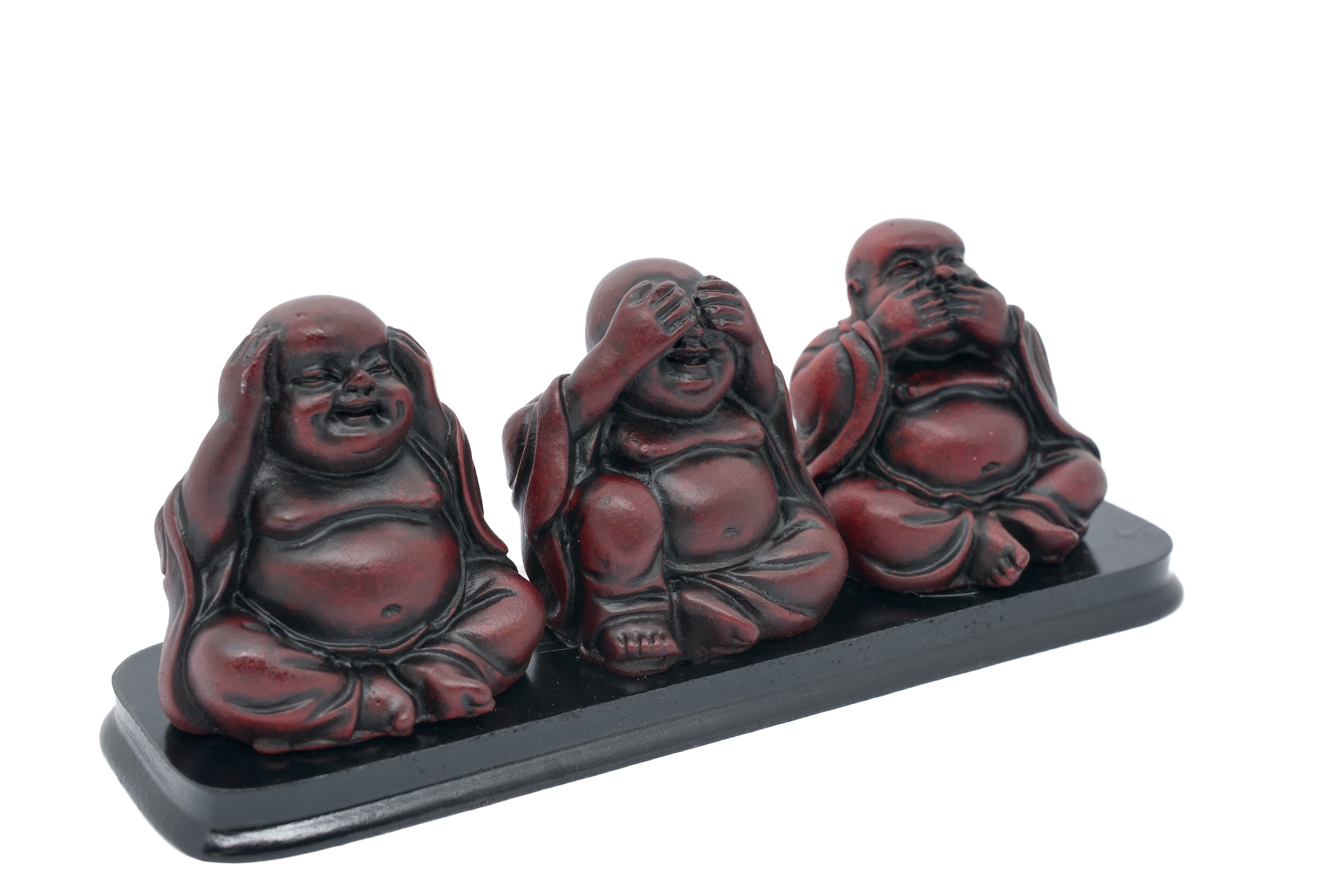 Groothandel – Hoor, Zie, Spreek Geen Kwaad – Lachende Boeddha Trio op Basis | Rood Polysteen