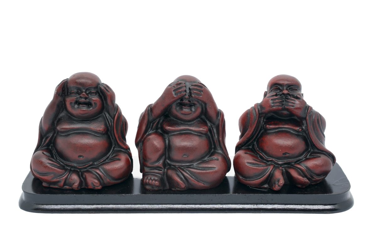 Design: Drie lachende Boeddha’s in Hoor Geen Kwaad, Zie Geen Kwaad, Spreek Geen Kwaad poses