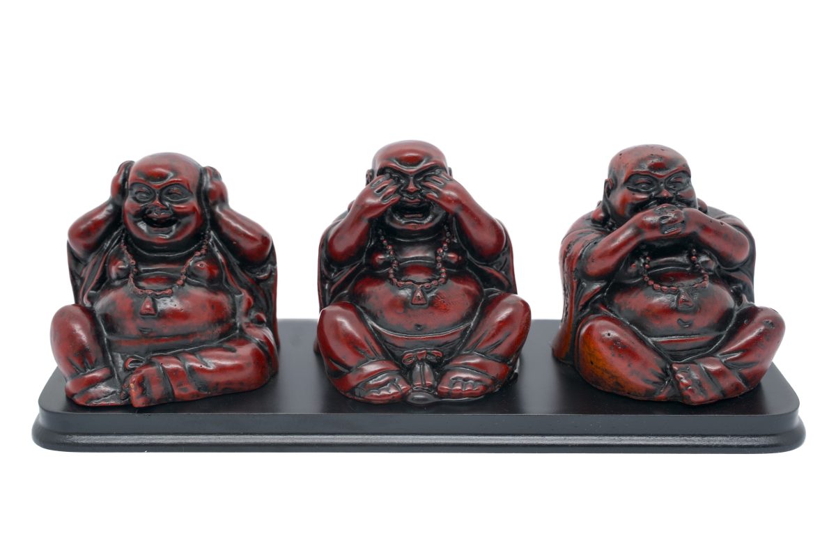 Design: Drie lachende Boeddha’s in Hoor Geen Kwaad, Zie Geen Kwaad, Spreek Geen Kwaad poses