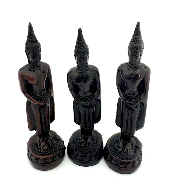 De figuur staat rechtop met de handen zacht gekruist voor het lichaam, wat verwijst naar het vredige moment na de verlichting waarin de Boeddha in diepe contemplatie over de Dharma stond. Deze houding straalt innerlijke balans, rustige kracht en bewuste aandacht uit.