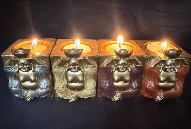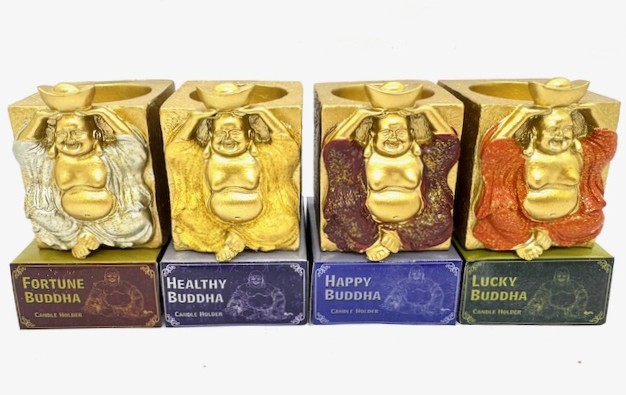 Groothandel – Lachende Boeddha Theelichthouder – Set (4 stuks)