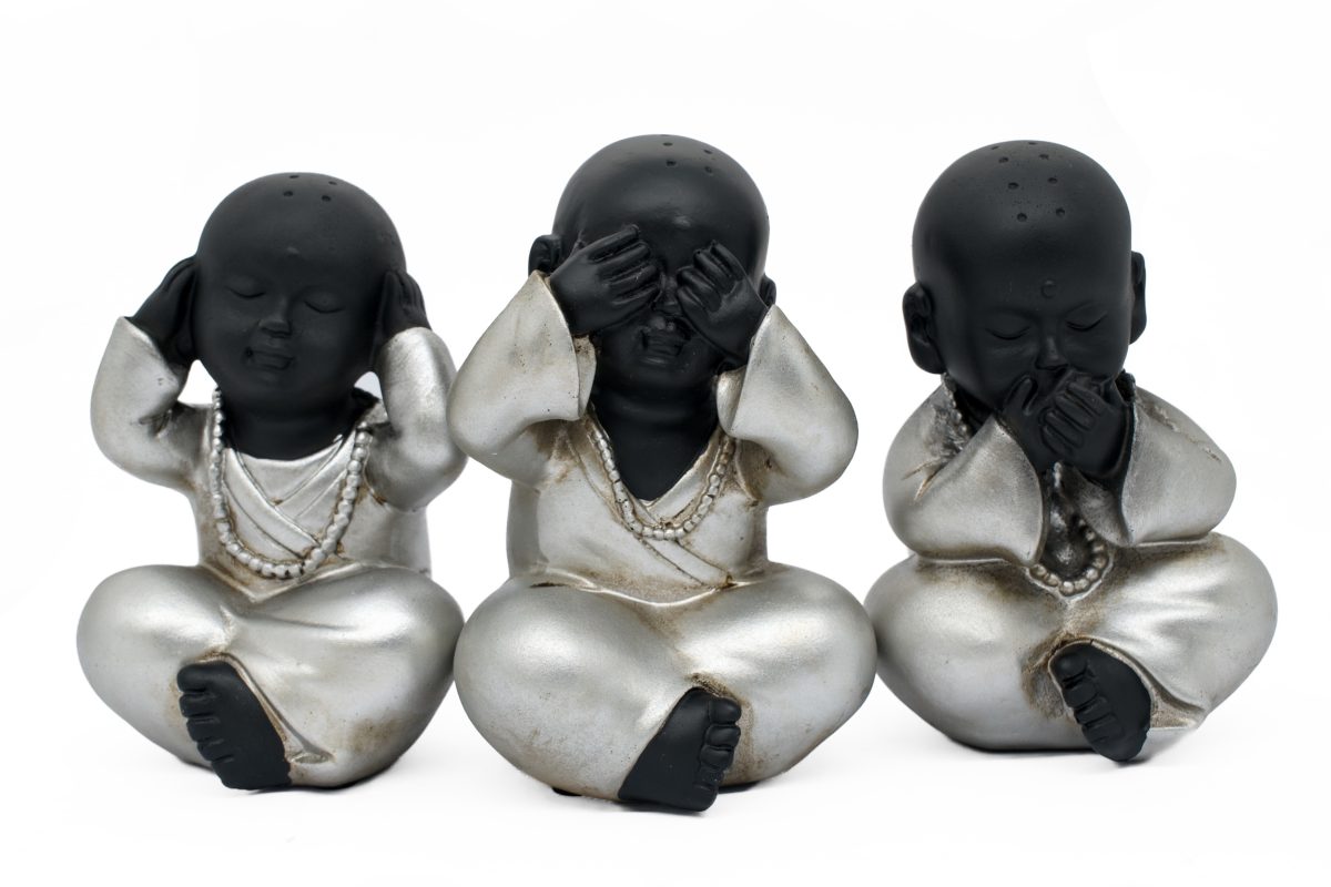 Design: Drie zittende baby monniken in Hoor Geen Kwaad, Zie Geen Kwaad, Spreek Geen Kwaad poses