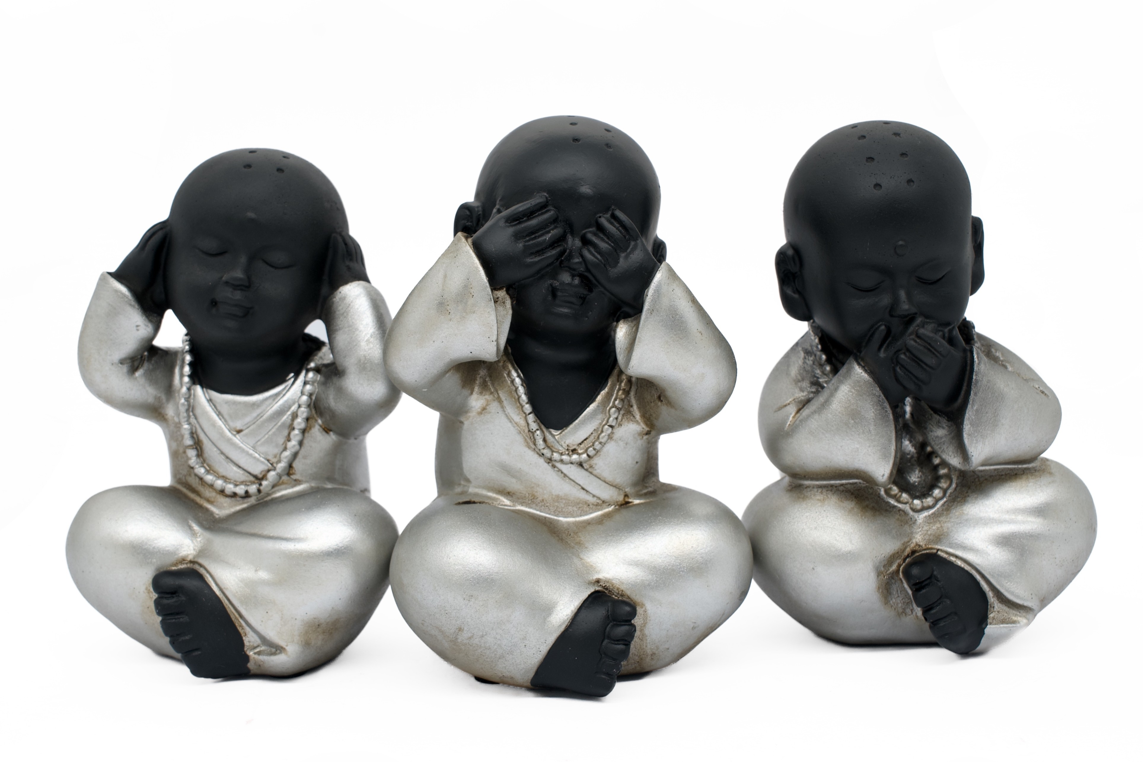 Elke monnik zit in een ontspannen ronde houding, handen voor oren, ogen en mond respectievelijk. Delicate gebedskralen rond elke nek voegen een betekenisvolle spirituele touch toe aan deze charmante en karaktervolle stukken.