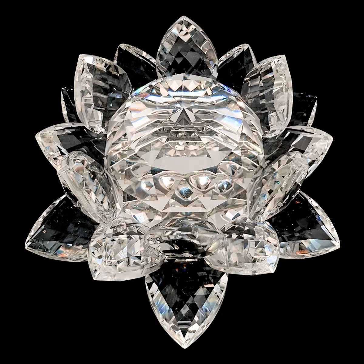Hele mooie luxe kristallen lotus. Het kristal materiaal is te vergelijken met Swarovski kwaliteit, erg glimmend en tot in de details afgewerkt. De lotus staat op een ronde glazen standaard. De lotus kan hier aan gedraaid worden.