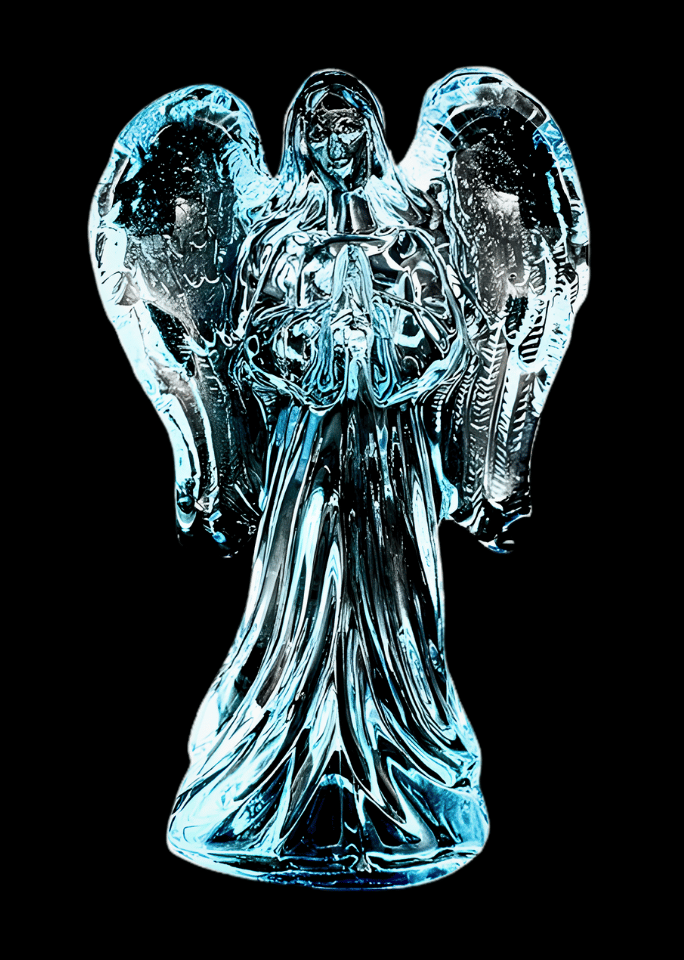 Staand engelbeeld met gevouwen handen, gedetailleerde vleugels en golvende mantel, gemaakt van kristalglas met een subtiele blauwe tint.