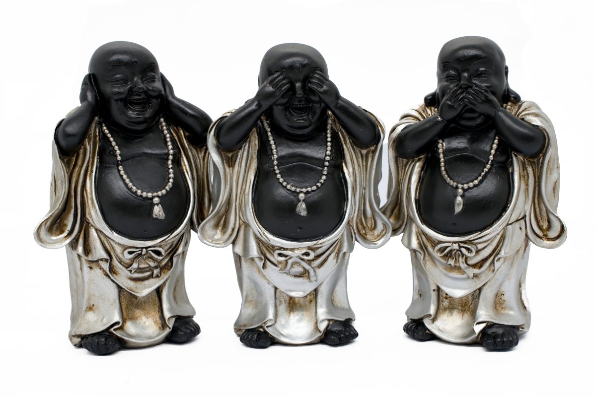 Design: Drie staande lachende Boeddha’s in Hoor Geen Kwaad, Zie Geen Kwaad, Spreek Geen Kwaad poses