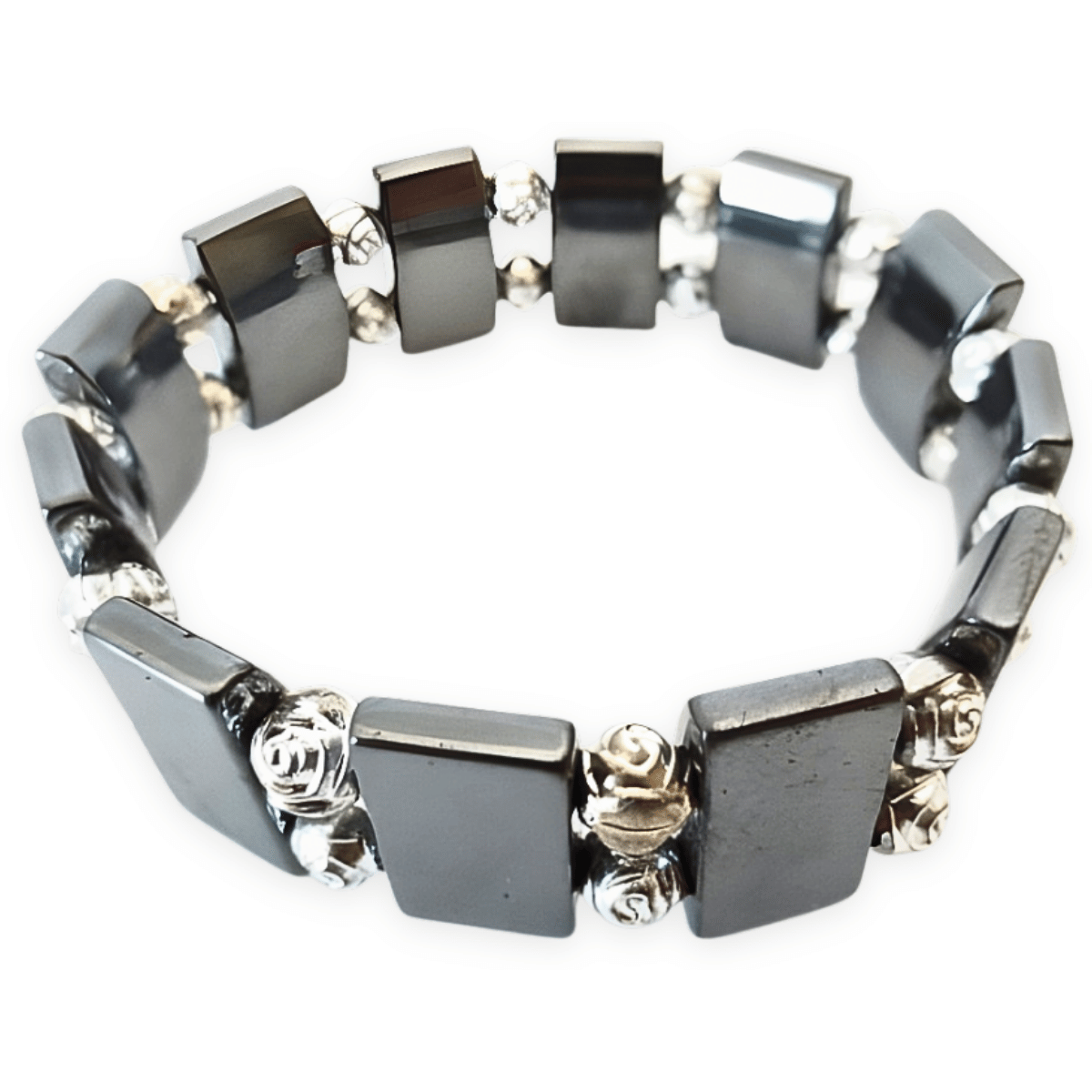 De armband is gemaakt van hematiet.