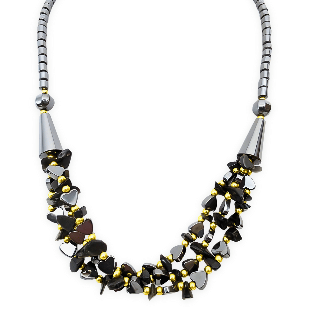 Prachtige hematiet ketting met tigeroogt edelsteentjes en hematiet hartjes. Deze ketting bestaat uit 3 lagen. De ketting is 45cm lang. Minimale afname is 2 stuks