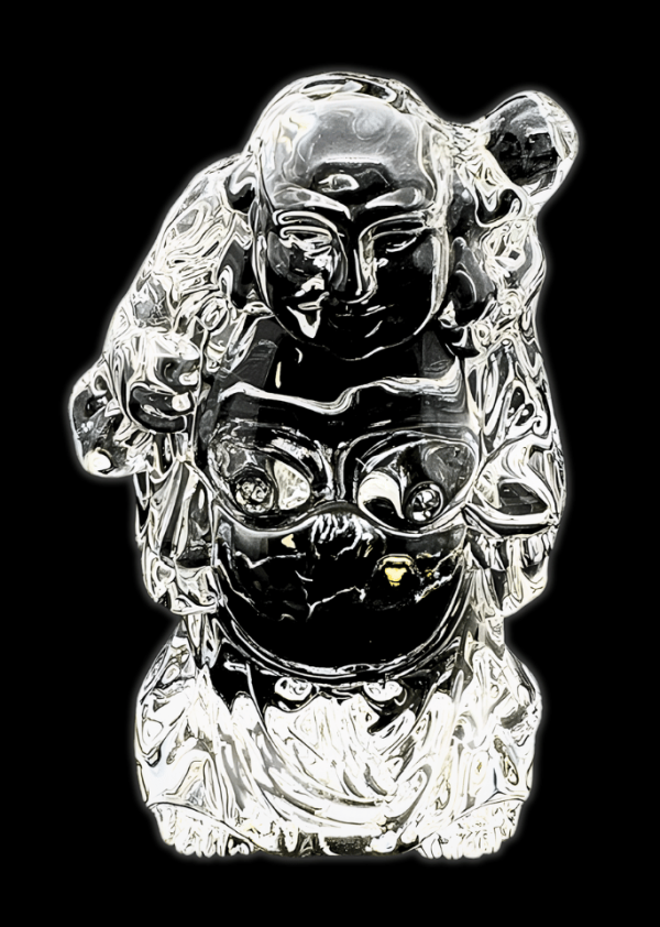 Klein staand Happy Boeddha-beeld van helder kristalglas met ronde buik, glimlachend gezicht en gewaad-details, met een bundel over de schouder.