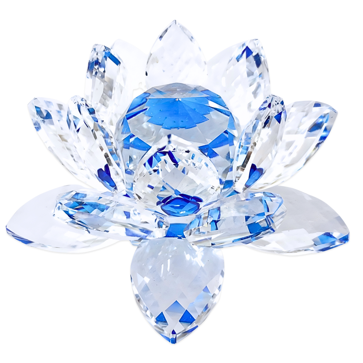 Compacte gefacetteerde kristallen lotusbloem met meerdere lagen heldere blaadjes en zachte saffierblauwe accenten. De verhoogde middensteen en de facetten van de blaadjes vangen het licht op en zorgen voor subtiele schitteringen, waardoor dit een fraai accent is voor planken, vensterbanken of kristaldisplays. In Feng Shui wordt de kristallen lotus vaak gebruikt als symbool voor zuiverheid, balans en harmonische energie, terwijl blauwtinten worden geassocieerd met rust en heldere communicatie.