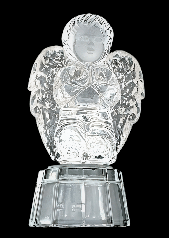 Klein engelbeeld van kristalglas met gevouwen handen, kindergezicht en structuurvleugels op een gefacetteerde voet. Het spel tussen helder en mat glas geeft een zachte, decoratieve uitstraling en maakt het geschikt als beschermengel of cadeau-artikel.
