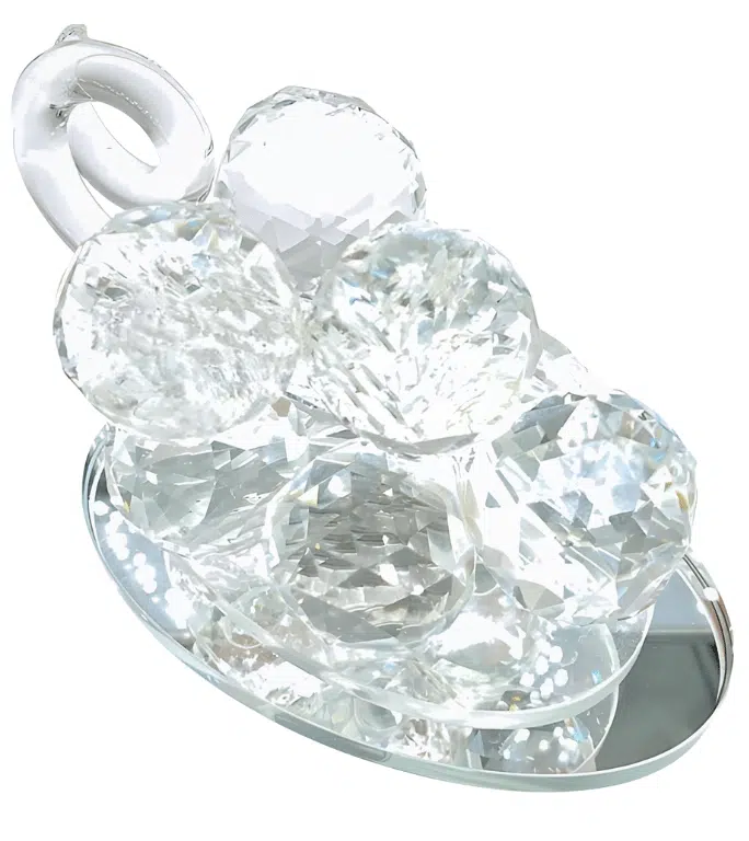 Middelgrote decoratie van kristalglas met een tros facetten-druiven op een ovaal spiegelend draaiplateau. De helder geslepen bollen vangen en weerkaatsen het licht en zijn geschikt als tafeldecoratie, etalage-item of cadeau. Deze uitvoering sluit aan bij onze kleine variant voor gebruik als set.