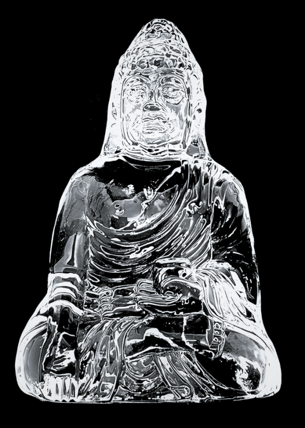 Compact zittend Boeddha-beeld van helder kristalglas met gewaad-details en de Varadamudra-handhouding, vaak verbonden met geven, zegen en compassie.