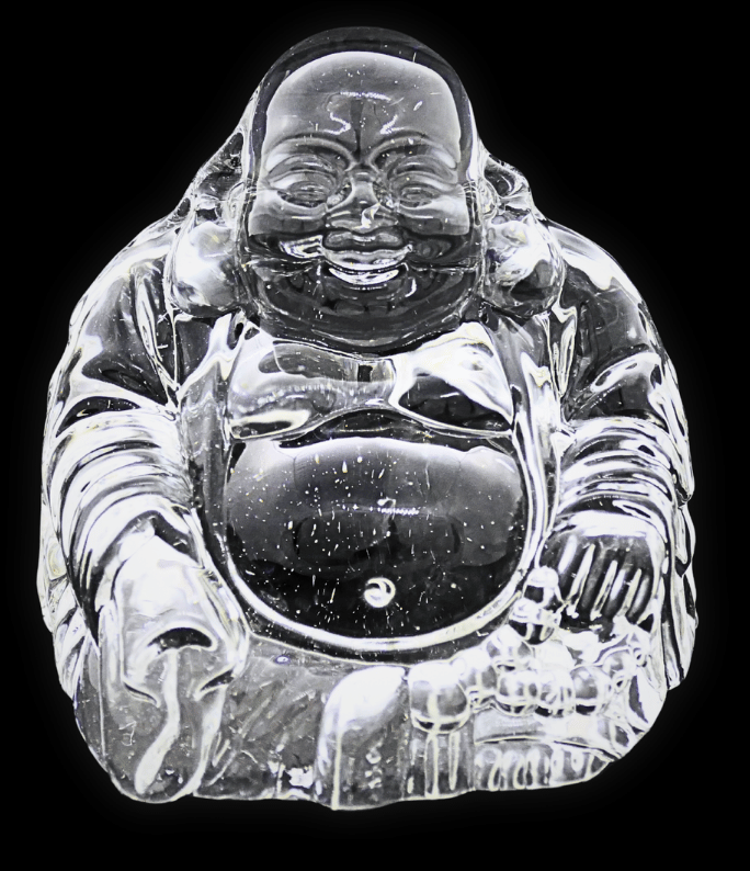 Massief Boeddha-beeld van kristalglas met lachend gezicht, ronde buik en één hand naast een Chinese goudbaar (yuanbao / yuni). Het heldere glas met kleine luchtbelletjes geeft een subtiele schittering; ook gezocht als Chinese Boeddha, Laughing Buddha of Feng Shui welvaarts-Boeddha.