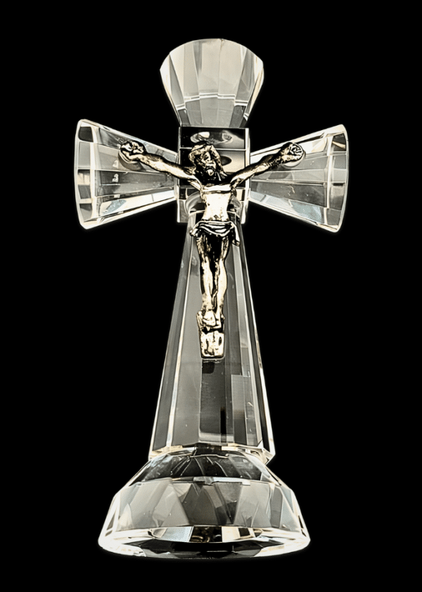 Facetgeslepen kruis van kristalglas op een ronde voet, met metalen Jezusfiguur aan de voorkant.