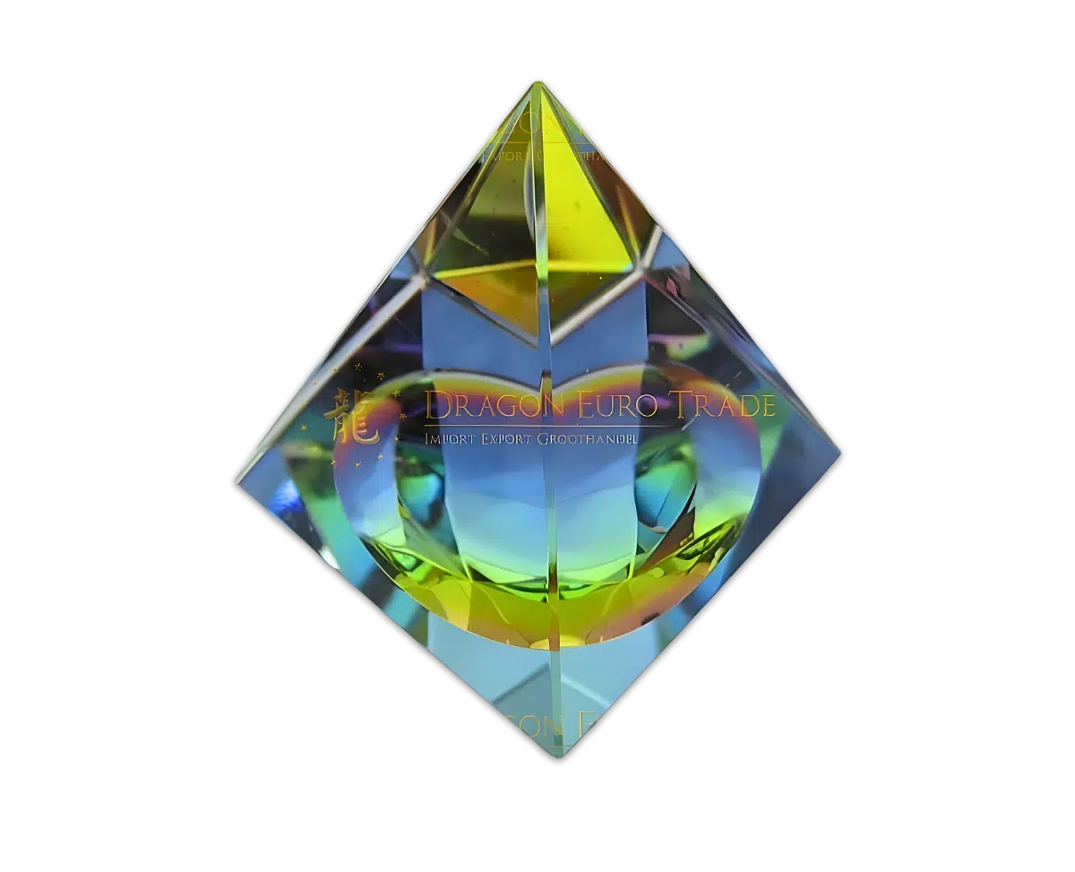 Grote gekleurde kristalglaspiramide met brede facetten en een duidelijke lensuitholling in de onderzijde. Het forse formaat, het gewicht en de iriserende kleurlaag zorgen voor intense regenboogreflecties en een sterke aanwezigheid, ideaal als statementstuk in vitrines, ontvangstruimtes of spirituele decoratie en zeer effectief op een lichtvoet.