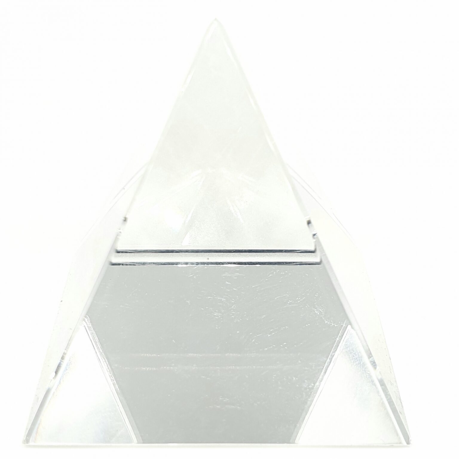 Grotere kristalglaspiramide met opvallende facetten en een stevig gewicht. Het helder wit-transparante lichaam en de spiegelende binnenvlakken vangen omgevingslicht en reflecties op en geven een rustige, geometrische uitstraling op planken, dressoirs of in vitrines. Vaak gebruikt als opvallende kristalsteen, voor meditatiehoeken of als blikvanger op een lichtvoet.