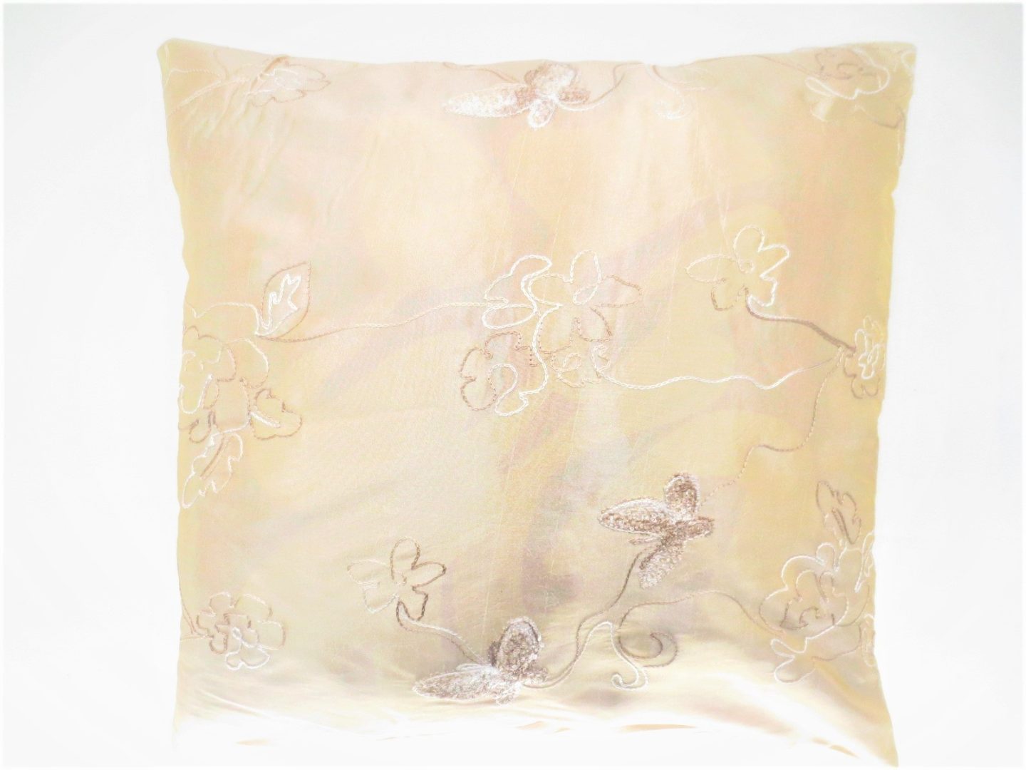 Mooie kussensloop met bloemetjes en vlindertjes erop genaaid.