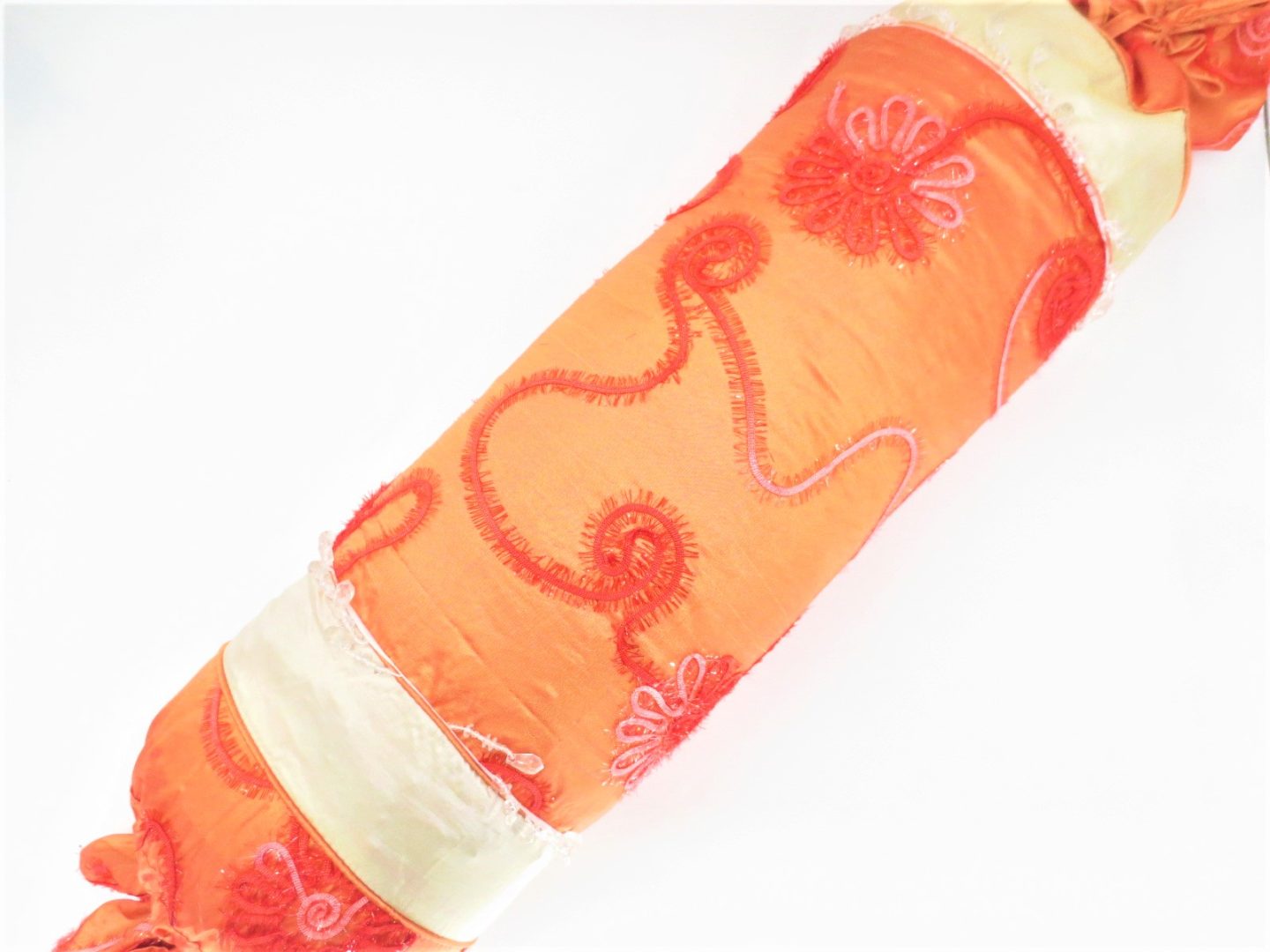 Hele luxe kussensloop voor op de bank of voor op de bed. Dit kussensloop is heel mooi versierd met erop genaaide bloemetjes. Ook hangen er kleine rode kristalletjes aan het kussen. Aan het uiteinde van beide kanten van het kussen zit een strikje. Het kussensloop bevat de kleuren geel en oranje.