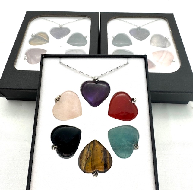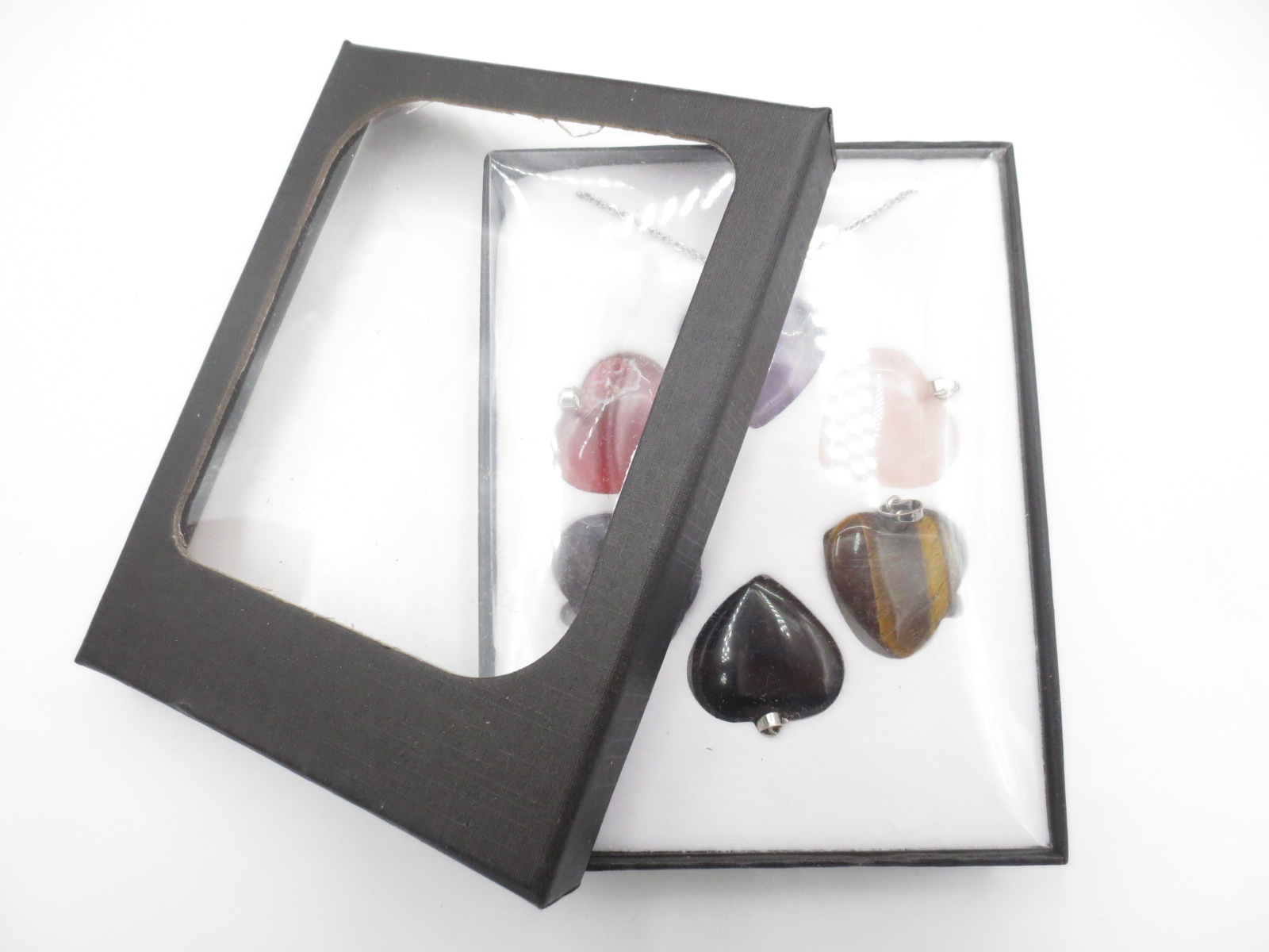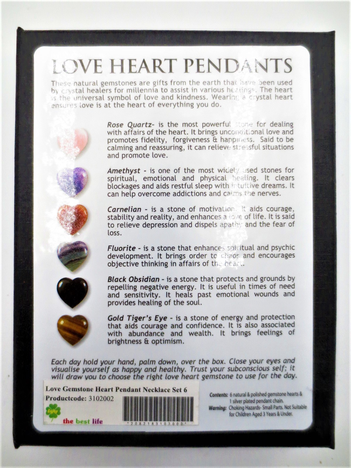 Deze elegante edelsteenkettingset bevat hartvormige hangers van rozenkwarts, amethist, carneool, fluoriet, zwarte obsidiaan en gouden tijgeroog. Elk kristal zou helende eigenschappen en positieve energie bevatten. Deze set is prachtig verpakt in een geschenkdoos en is perfect voor liefhebbers van spirituele sieraden, als attent cadeau of voor persoonlijke energiebalans.