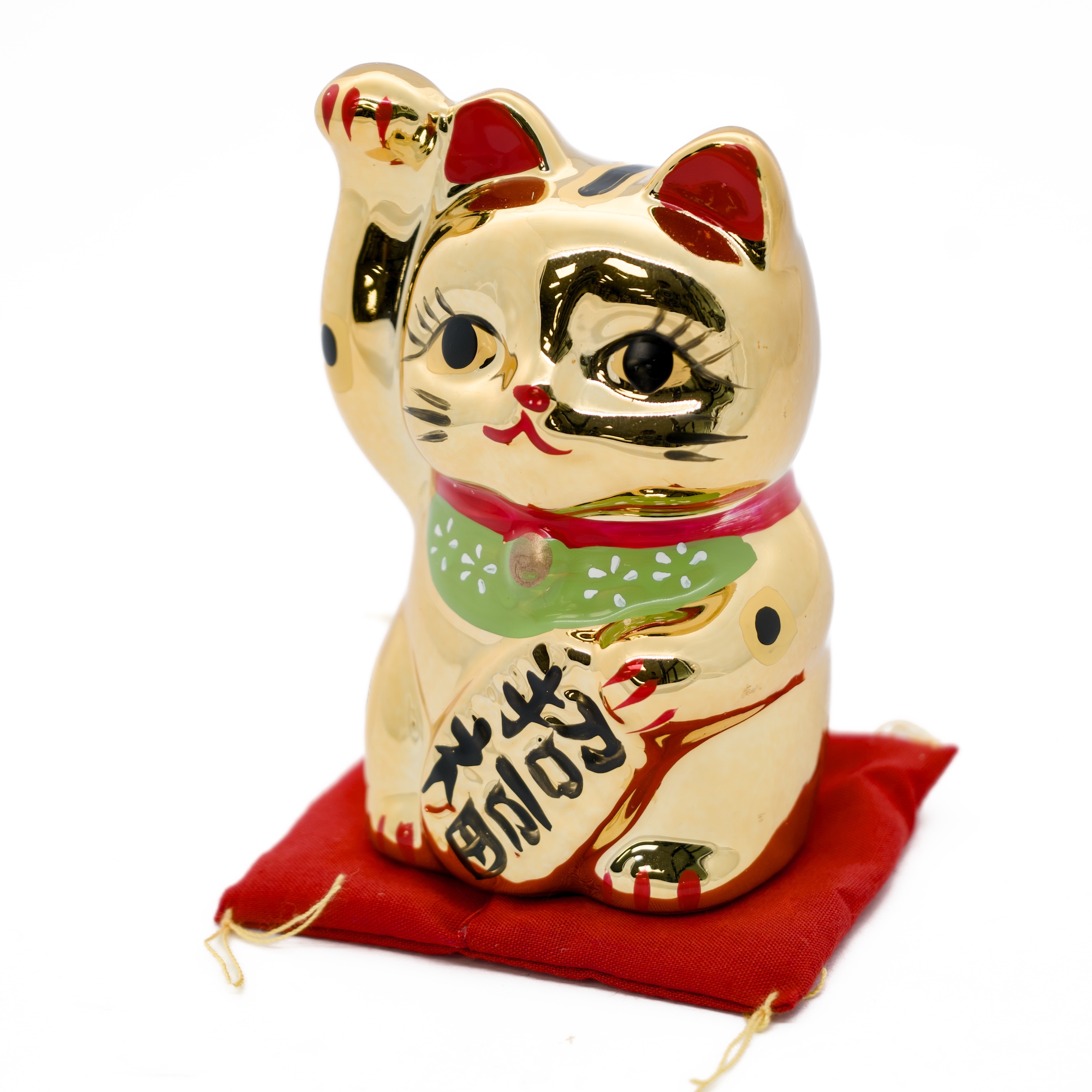 Dit elegante katje heeft één poot omhooggeheven en houdt een gouden koban munt met de tekens 招財 (“Rijkdom aantrekken”) vast. De grote expressieve ogen met lange wimpers geven haar een uniek vrouwelijk karakter. Een sierlijk blauw halsbandje met witte bloemmotieven siert haar nek. Het hoogglans goud metallic lichaam straalt luxe en welvaart uit. De spaarpot wordt geleverd op een rood fluwelen kussen met gouden koordjes — klaar om cadeau te geven.