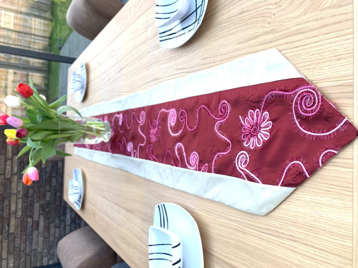 Elegante geborduurde tafelloper – Bordeauxrood en Zilverkleurige decoratieve tafelloper