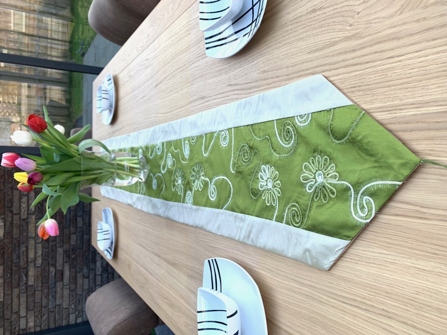 Elegante geborduurde tafelloper – Groen en Zilverkleurige decoratieve tafelloper