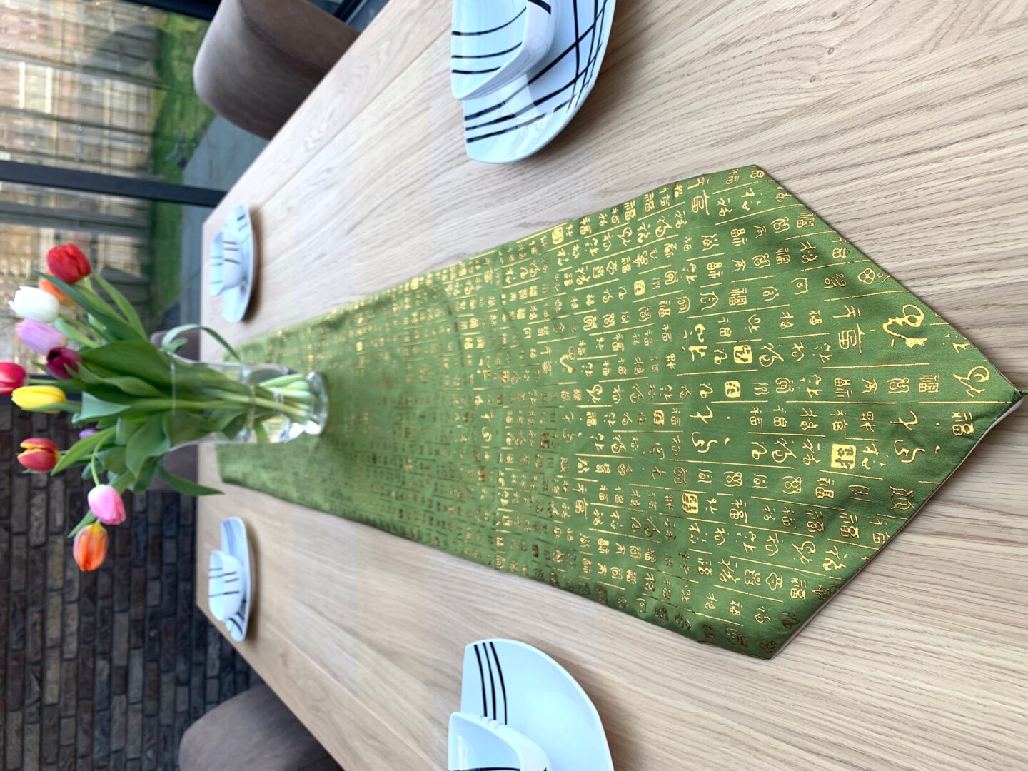 Elegante geborduurde tafelloper – Olijfgroenleurige decoratieve tafelloper