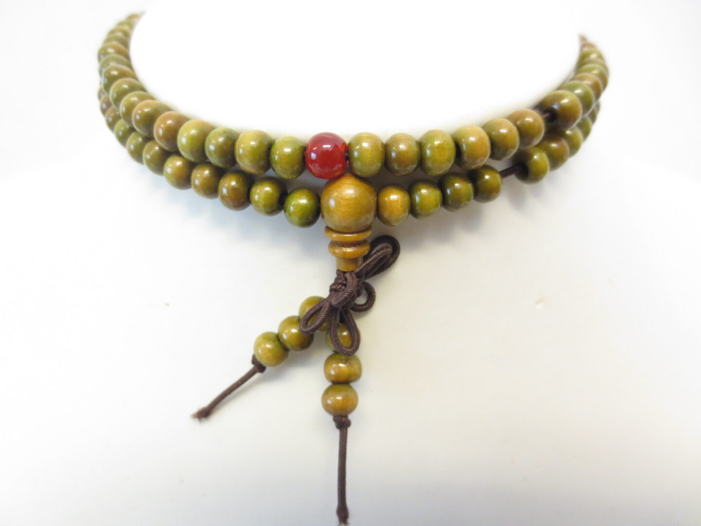 De kralen zijn gemaakt van sandalhout. Mala wordt gebruikt om het tellen bij te houden bij het chanten van een mantra, een beoefening die in het Sanskriet Japa word genoemd (herhaling van gebeden, spreuken en godennamen).