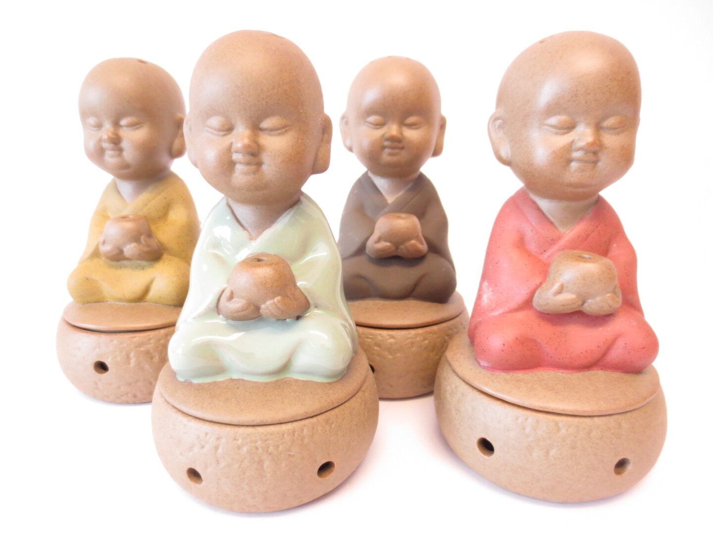 Mooie wierook/kegelbrander met 4 monniken in verschillende kleuren. De monnik heeft een kommetje in zijn hand. Onder de monnik is er ruimte om een kegelpuntje te branden. De rook van de kegel komt vrij via het hoofdje van de monnik, waar gaatjes in zitten.De wierook/kegelbrander is gemaakt van fijn aardewerk.Prijs is per set van 4. Afmeting van de monnik is 15cm hoog en 7cm breed