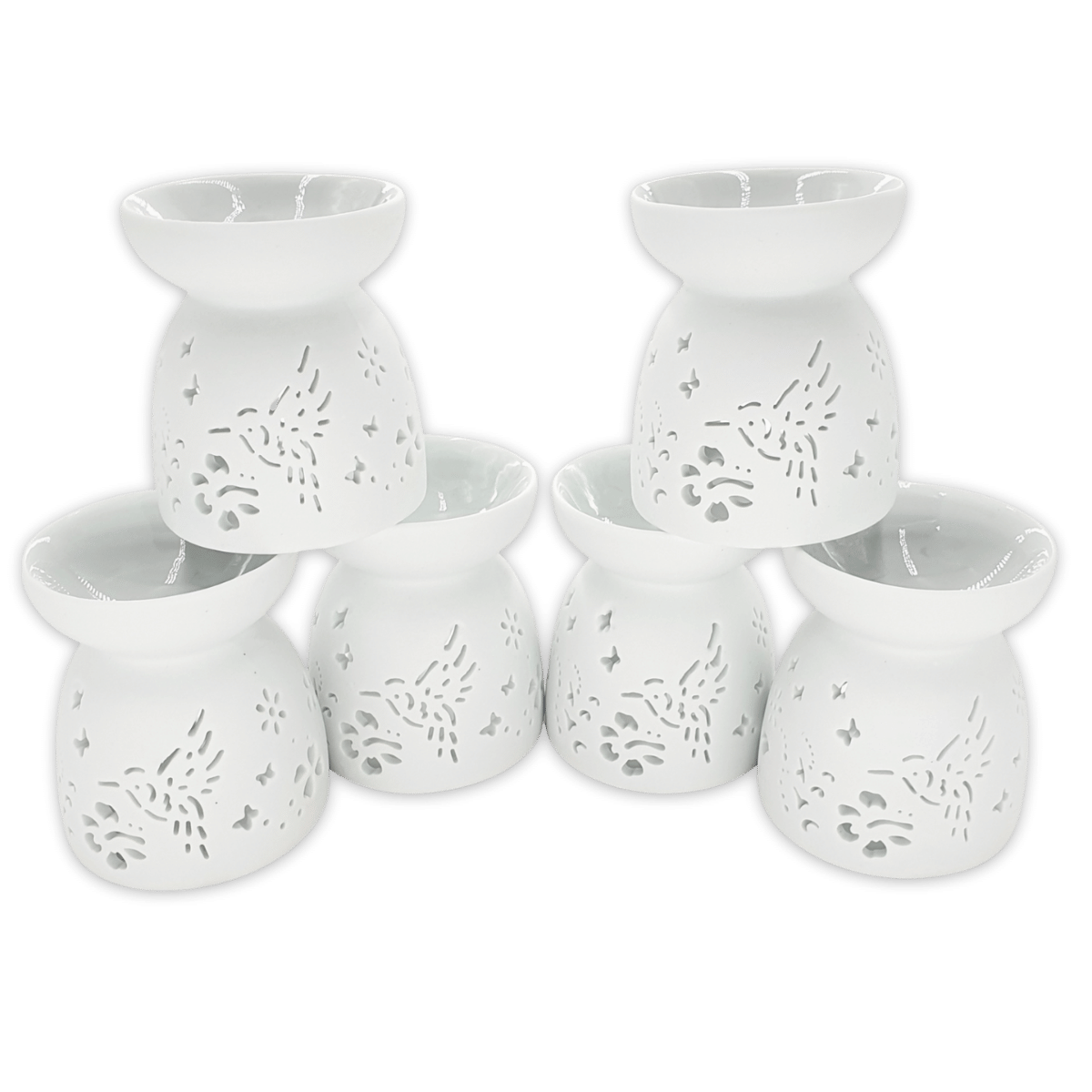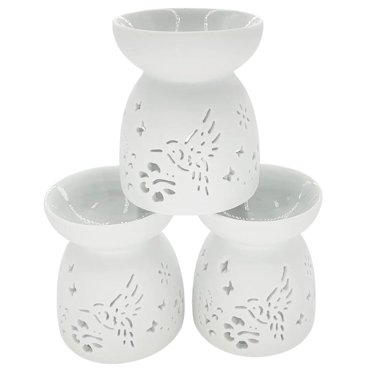 Witte keramische oliebrander set met een fijn vogel- en sterpatroon.