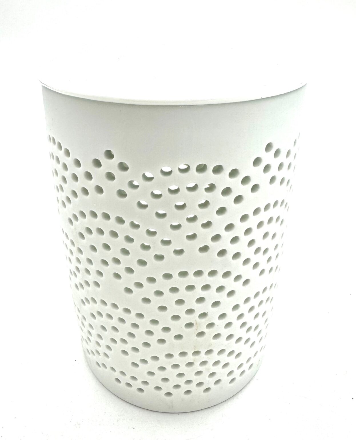 Witte keramische oliebrander met een hoge cilindervorm en rijen kleine ronde uitsparingen in een golvend patroon. De brander heeft een losse, ronde keramische basis voor het theelichtje, die onder de houder wordt geschoven, terwijl het vaste schaaltje bovenop geschikt is voor geur- of etherische olie of een kleine waxmelt. Bij gebruik ontstaat een band van lichtpuntjes, geschikt voor woongeurcollecties, winkels en praktijkruimtes.
