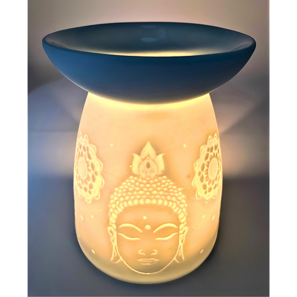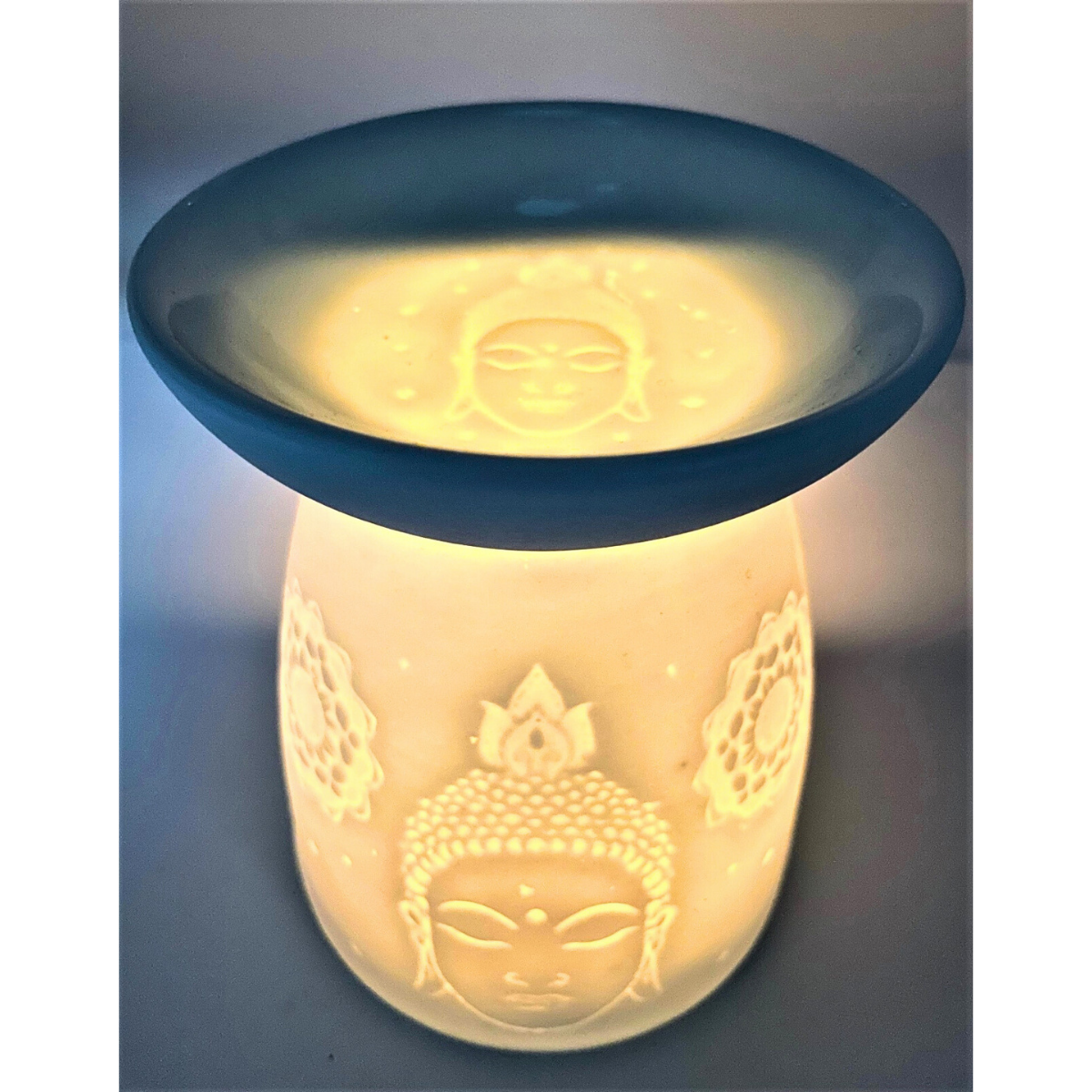 Witte keramische oliebrander met een Thaise Boeddha in reliëf aan de buitenkant.
