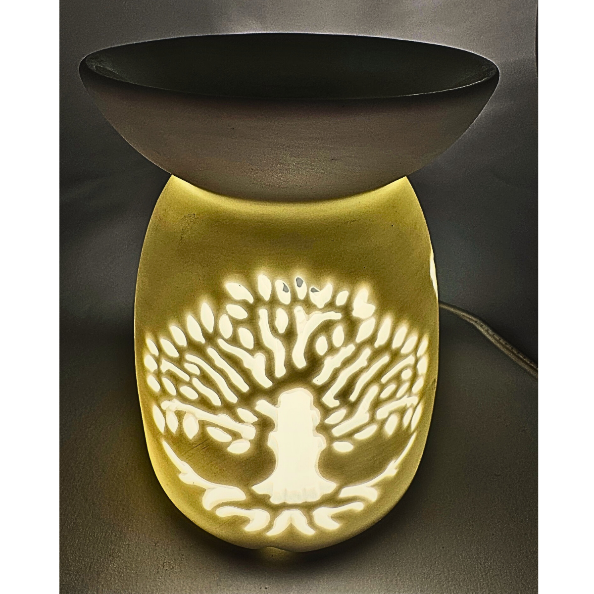 Witte keramische oliebrander met een uitgesneden Levensboom en twee vogels in de takken.