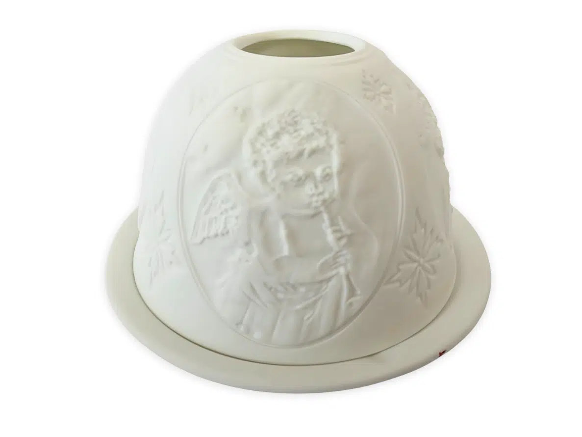 Inbegrepen: Porseleinen waxinelichthouder (ronde schaal en decoratieve koepelkap), verpakt in een standaard kartonnen doos met beschermend bubbelplastic. Geen kaars meegeleverd.